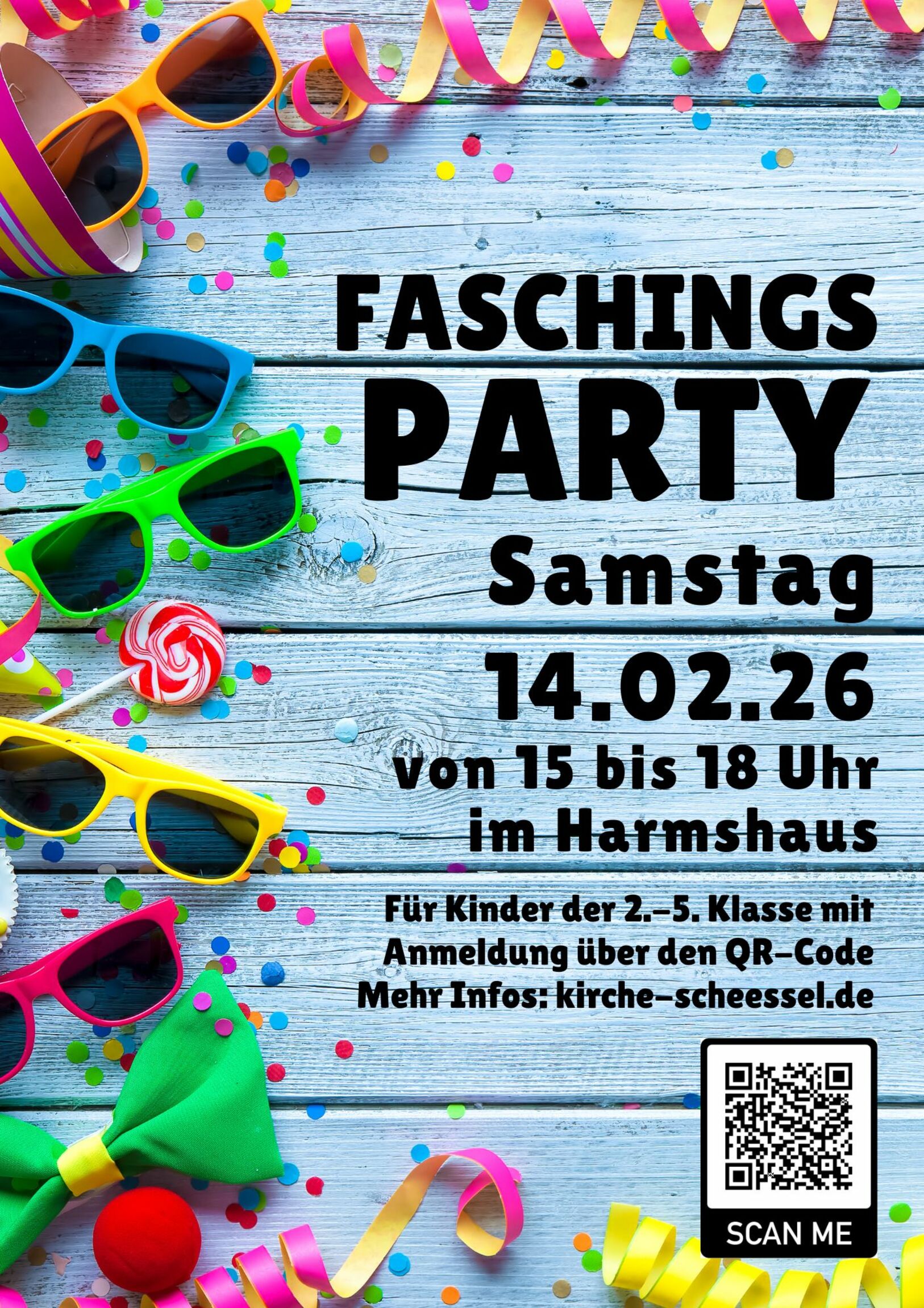 Nach der Nikolausparty geht’s weiter mit der Faschingsparty! Am Samstag, 14.02.26, von 15.00 bis 18.00 Uhr feiern wir im Harmshaus in Scheeßel. Kinder der 2.-5. Klasse sind eingeladen. Verkleidet kommen oder vor Ort etwas aus der Verkleidungsbox aussuchen – beides geht! Der Juleica-Kurs plant die Party als Praxisprojekt mit Unterstützung von erfahrenen Teamern. Es gibt tolle Ideen und Aktionen! Damit die Jugendlichen besser planen können, meldet euch bis 12.02. über den Link an.